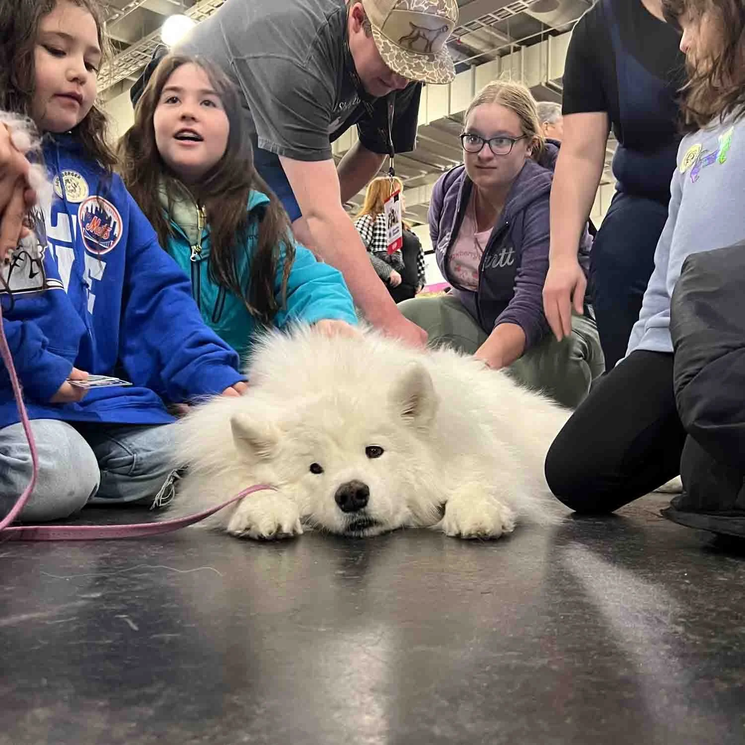 Tina and I had a long conversation about the Samoyed coat. As you can probably guess, that thick, luxurious, fluffy, white coat provided Sammies with protection against the harsh weather of Siberia. They have a profuse double coat, with a longer outer coat of tougher hair and a soft, thick, wooly undercoat. They shed quite a bit, which increases during shedding season. That can happen twice a year. They should be brushed daily to remove dirt, loose hair, and to keep the dog looking its best. Tina stressed to me that Samoyeds should not get haircuts! Even if you live in an area with an especially warm climate. She told me the ends of a Sammy’s hair have special silver tips that help reflect light, acting as a natural mechanism to keep the dog cool in warm weather. If you cut the tips off, your Sammy runs the risk of overheating. Tina said let your dog’s environment dictate the development of your Samoyed’s coat. If you live in, say, Florida, your Sammy will acclimate to the warmer weather without any special help from you. As with a trainer, Tina requires prospective owners to have a professional groomer engaged as a condition of ownership.