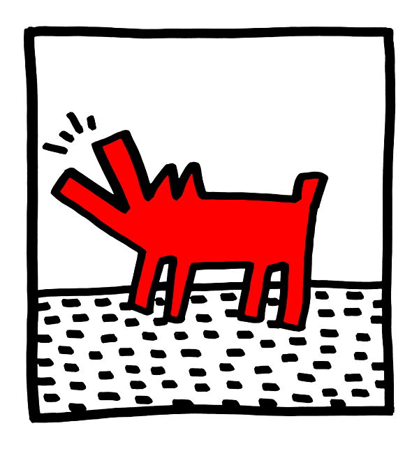 Haring was a prominent artist in New York City from the late 1970s to 1990, when he died of AIDS. His popularity grew from the chalk drawings he made in city subways of various types of figures, including dogs. You can see one example below, Dancing, Barking Dogs.
