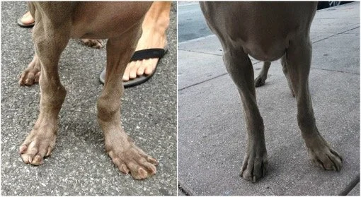 Below are “before” and “after” pictures of his front legs which were hit hardest by the disease. On the left, you can see how knobby the joints were and that his wrists had no strength and that his paws laid almost flat on the ground. You can see on the right that his legs are far less lumpy and that he’s largely resting on his toes as he should.
